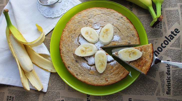 Тісто викладаємо у форму, змащену олією. Ставимо в духовку та випікаємо 30 хвилин при температурі 180 градусів. Готову запіканку прикрашаємо нарізаними бананами. Смачного!