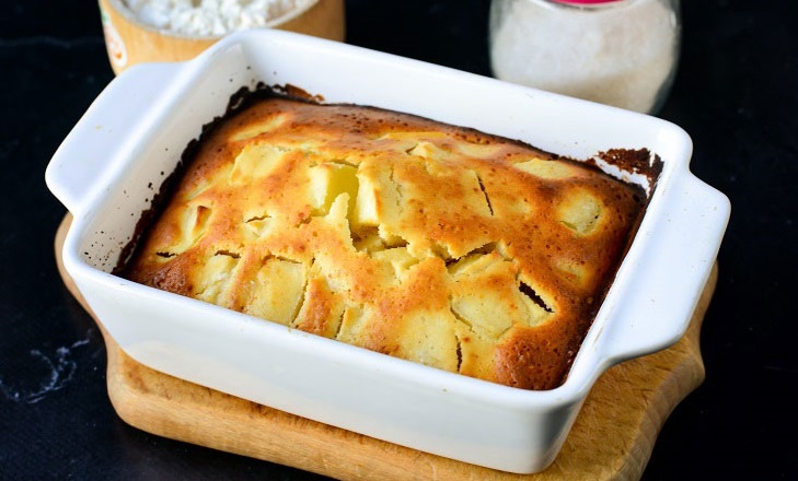 Тісто з’єднуємо з яблуками та перемішуємо. Потім виливаємо все у форму й ставимо в духовку. Яблучну запіканку випікаємо 40 хвилин при температурі 180 градусів. Смачного!