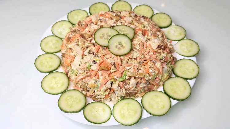Викладаємо салат на велику тарілку і прикрашаємо його кружальцями свіжого огірка. Салат готовий. Поєднання інгредієнтів сподобалося всім, хто його куштував! Смачного!