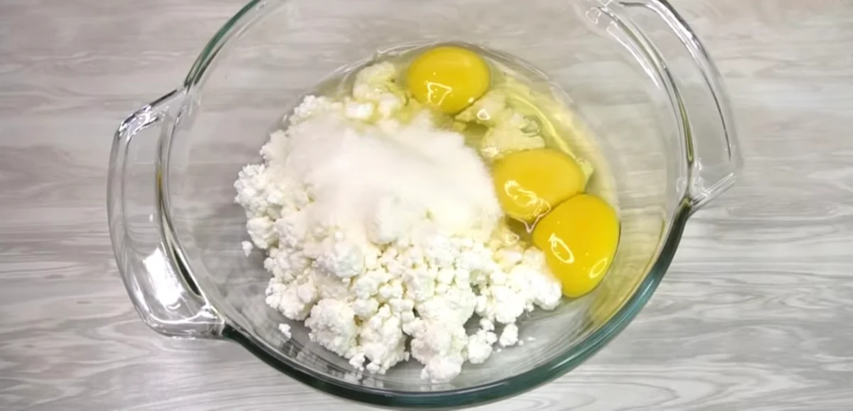 В чисту тарілку кладемо сир. До нього додаємо яйця, ванілін, сіль та цукор.