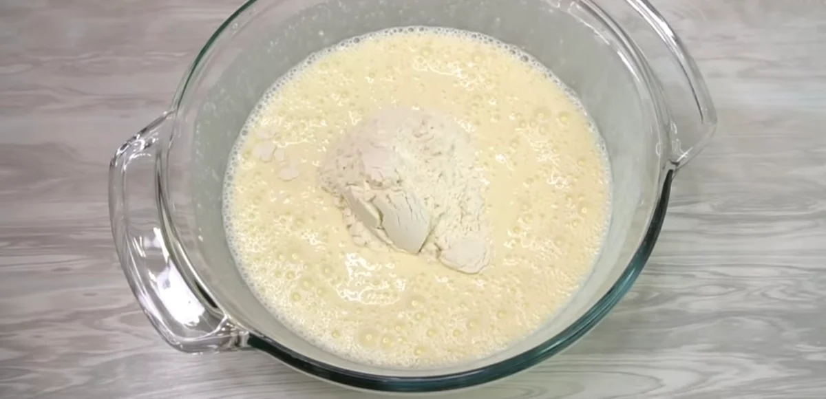 Все ретельно збиваємо блендером. Потім додаємо борошно та розпушувач. Суміш перемішуємо за допомогою вінчика.