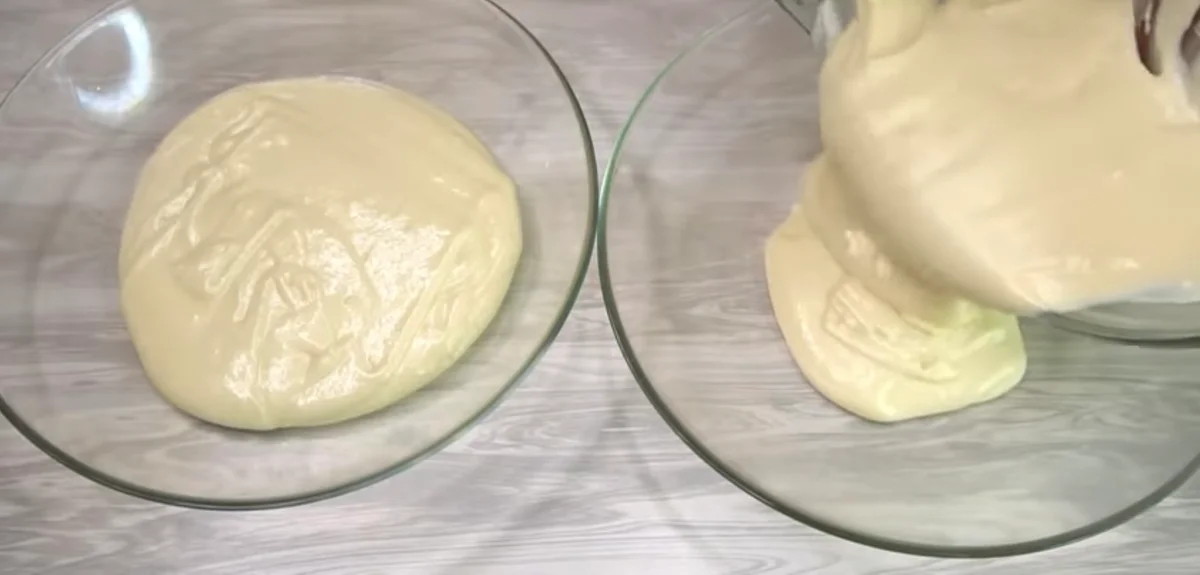 Вершкове масло розтоплюємо й додаємо до тіста. Все перемішуємо. Тепер тісто слід розлити у дві чисті тарілки.