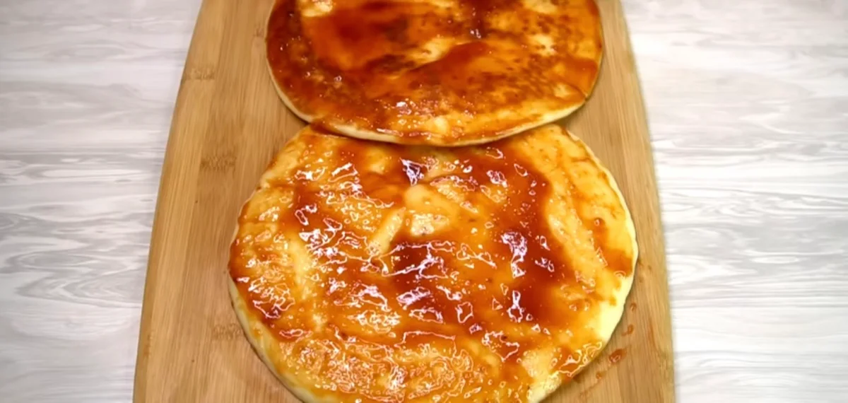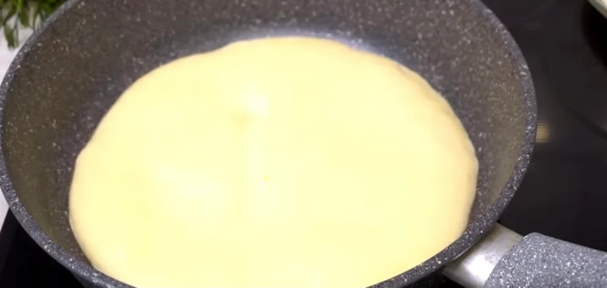 Сковорідку розігріваємо на вогні й додаємо рослинну олію. Викладаємо на сковорідку тісто з однієї тарілки. Накриваємо кришкою та випікаємо на маленькому вогні приблизно 5 хвилин. Потім викладаємо іншу частину тіста й випікаємо його з двох сторін до готовності.