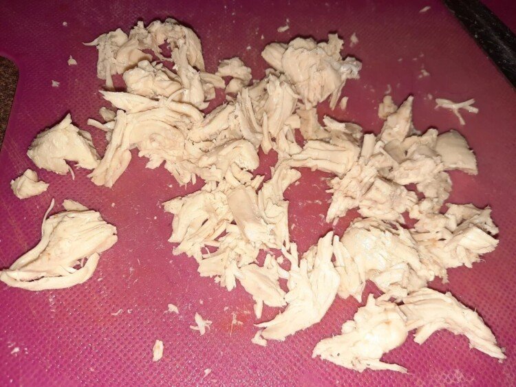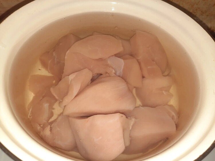 1. Ріжемо м’ясо шматочками і ставимо варитися до готовності. (Ми використали куряче філе, але зі свинини теж дуже смачно!)