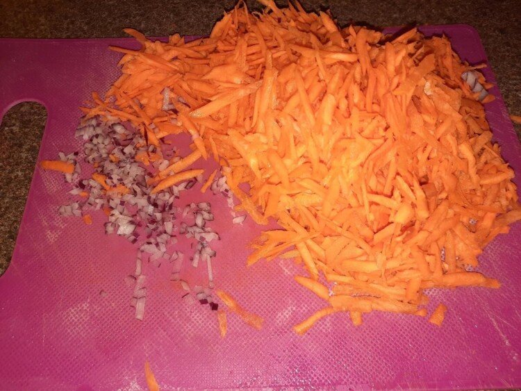 2. Натираємо моркву на крупній тертці і дрібно ріжемо цибулю. Цибуля може бути червоною або звичайною.