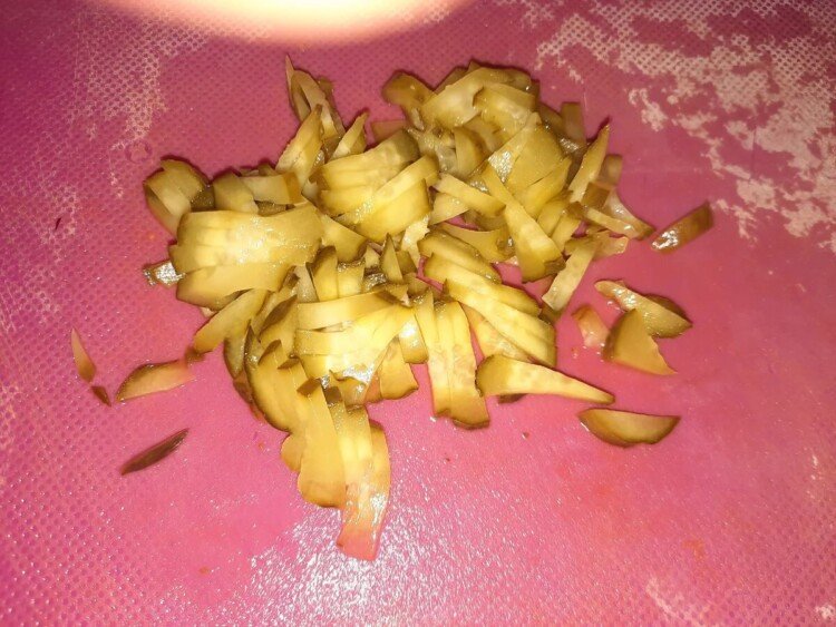 4. Ріжемо огірки дрібною соломкою. Обов’язково використовуйте тільки смачні огірки, від цього залежить смак салату.