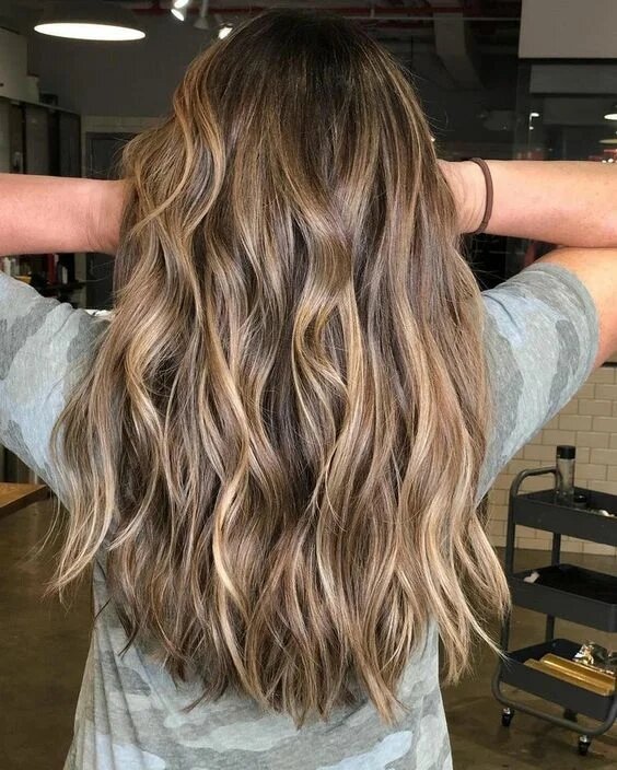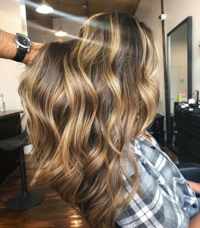 Колір мокко з карамелевими акцентами – ідеальний варіант smoky gold для темно-русявих жінок або шатенок. Подивіться, як красиво переливається і виблискує волосся! Тонкі світлі пасма перемішуються з темними і створюють ефект багатовимірності.