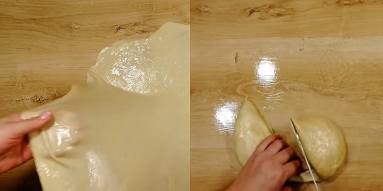 Змастіть соняшниковою олією робочу поверхню, а також готове тісто. Останнє розділіть навпіл. Частину тіста слід максимально тонко розкачати, а потім знову змастити олією.