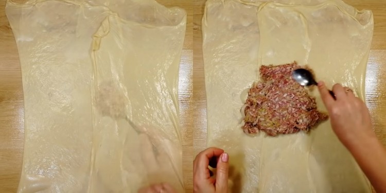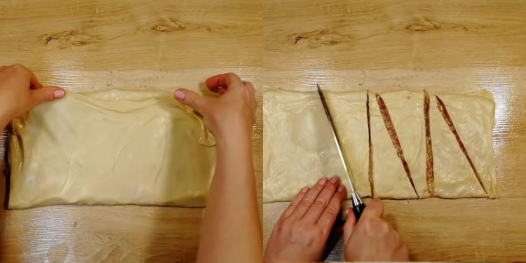 Лівий і правий краї з’єднайте в центрі розкачаного тіста. Перпендикулярно до шва на середину тіста викладіть тонким шаром половину начинки. Накрийте її верхньою і нижньою частиною тіста. Отриманий прямокутник поділіть на трикутники.