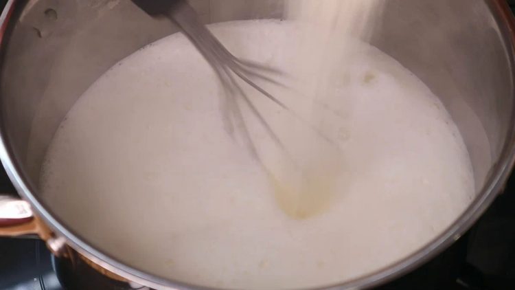 Тепер готуємо дуже густу манну кашу. Молоко з цукром, сіллю та ваніліном доводимо до кипіння. І потім тонким струмком додаємо манну крупу постійно помішуючи при цьому віничком. Коли додали манку, продовжуємо помішувати її віничком безперервно, тому що густіє вона моментально і може дуже сильно прилипнути, а віничком ні грудочок не буде, ні прилипання.