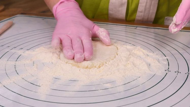 На робочу поверхню насипаємо борошно і зверху кладемо столову ложку з гіркою манки, присипємо борошном і швиденько розплющуємо в коржик. Борошно потрібне, тому що манка дуже липка і, використовуючи борошно, стає вже зовсім не гаряче, ручки не обпечете точно, не переживайте!
