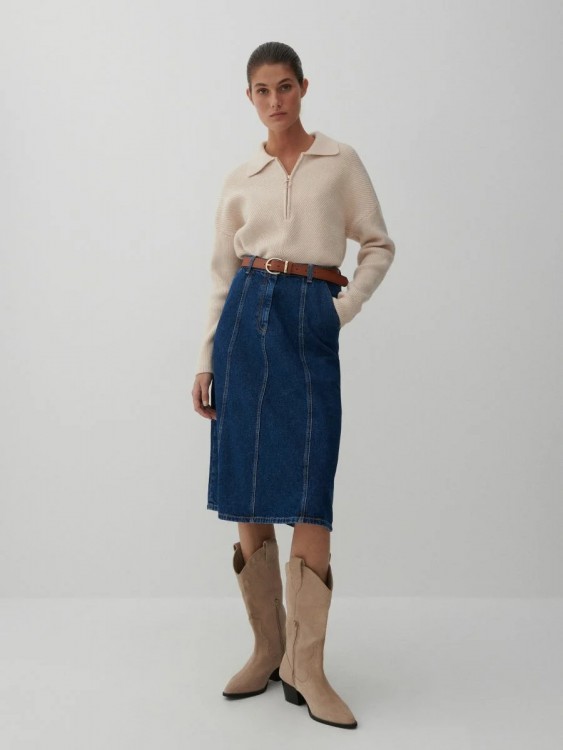 Після довгих років забуття джинсові спідниці знову в моді – міні, міді, максі. Монохромні або з декількох шматочків джинсової тканини різних кольорів. Це результат прагнення дизайнерів до естетики 2000-х. У цьому сезоні популярні образи в стилі денім. Але вони також будуть добре поєднуватися з трикотажними тканинами, такими як топ і кардиган.