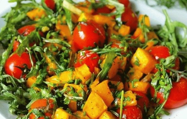 Салат з гарбуза, овочів та зелені ідеально підійде людям, які бояться набрати зайві кілограми. Страва виходить ситною, смачною, а головне малокалорійною.
