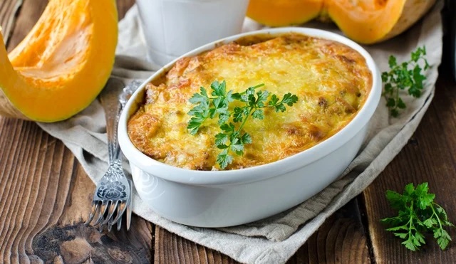 Викладаємо гарбуз й посипаємо рештою твердого сиру. Страву відправляємо в духовку, розігріту до 180-ти градусів. Запікаємо її приблизно 30 хвилин. До столу гарбузову запіканку подаємо гарячою. Смачного!