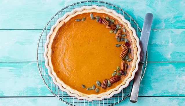 Пісочне печиво перетворюємо на крихту. Додаємо трішки вершкового масла та перемішуємо. Половину печива викладаємо у форму та утрамбовуємо. Потім викладаємо гарбузову начинку. Зверху посипаємо рештою печива. За бажанням прикрашаємо горіхами або родзинками.