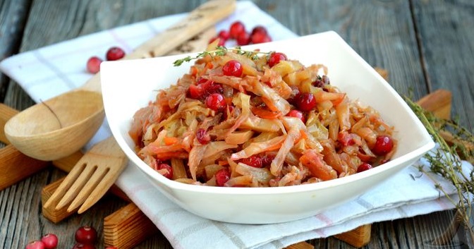 Через деякий час додаємо сіль, цукор та чорний перець. Всипаємо журавлину та тушкуємо страву до кінця. До столу її подаємо гарячою. Смачного!