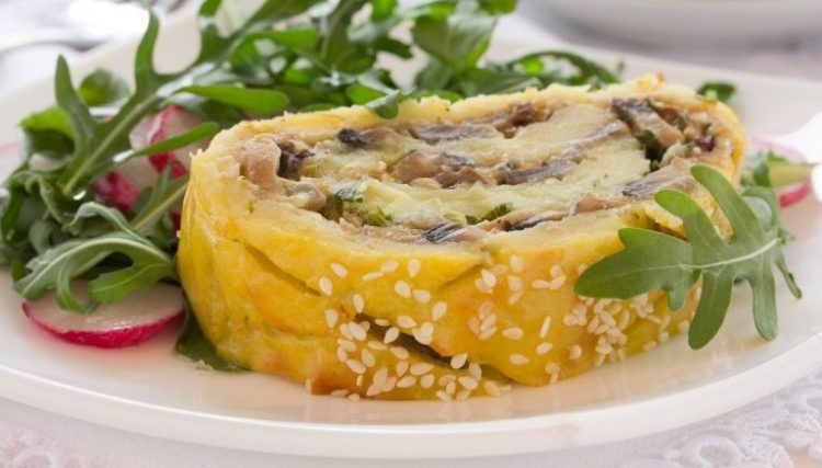 Ставимо в духовку та запікаємо до рум’яної скоринки. Готовий картопляний рулет з грибами ріжемо на шматочки й подаємо до столу. Смачного!