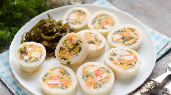 Кальмари, фаршировані крабовими паличками та морською капустою