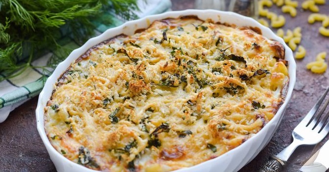 Соусом поливаємо запіканку. Зверху посипаємо тертим сиром. Ставимо її в духовку й запікаємо 30 хвилин при температурі 180 градусів. Готову запіканку подаємо до столу. Смачного!