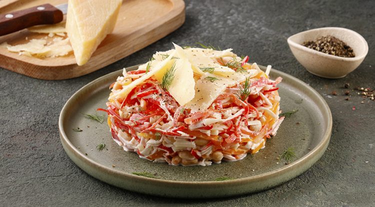 Потім страву заправляємо майонезом. Додаємо сіль, перець та спеції. Ретельно перемішуємо. На тарілку ставимо кільце й викладаємо туди салат. Кільце акуратно знімаємо, а страву прикрашаємо кропом та тоненькими шматочками сиру. Смачного!
