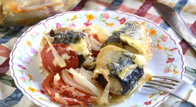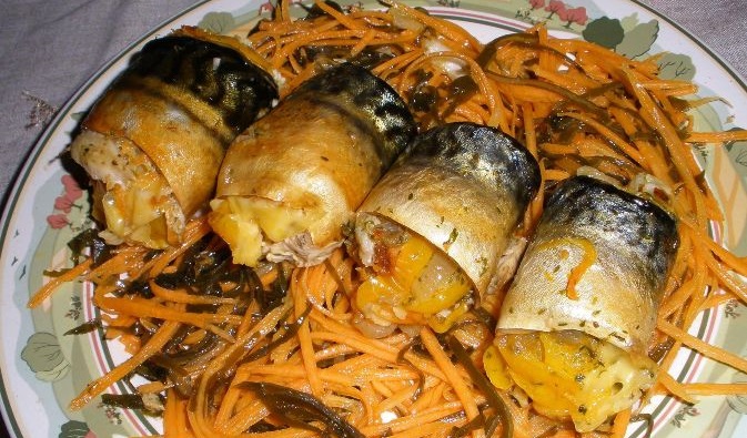 Одну моркву натираємо на тертці. Цибулю подрібнюємо. Овочі обсмажуємо до золотистої скоринки. Викладаємо їх на кожний шматочок скумбрії та загортаємо в рулетики. Викладаємо у форму та запікаємо 30 хвилин при температурі 190 градусів.