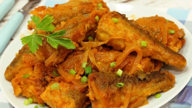 Тушкована риба з цибулею в томатно-гірчичному соусі