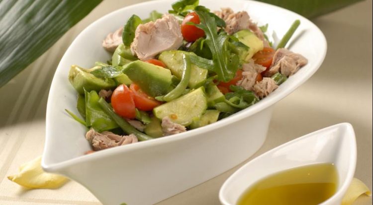 Стручкову квасолю розморожуємо та нарізаємо. Додаємо руколу, нарізані огірки, помідори та авокадо. Інгредієнти перемішуємо. Потім додаємо консервований тунець. Солимо, перчимо. За бажанням додаємо улюблені спеції.