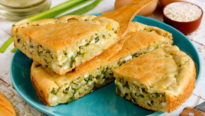 Заливний пиріг з рисом, яйцями та зеленою цибулею