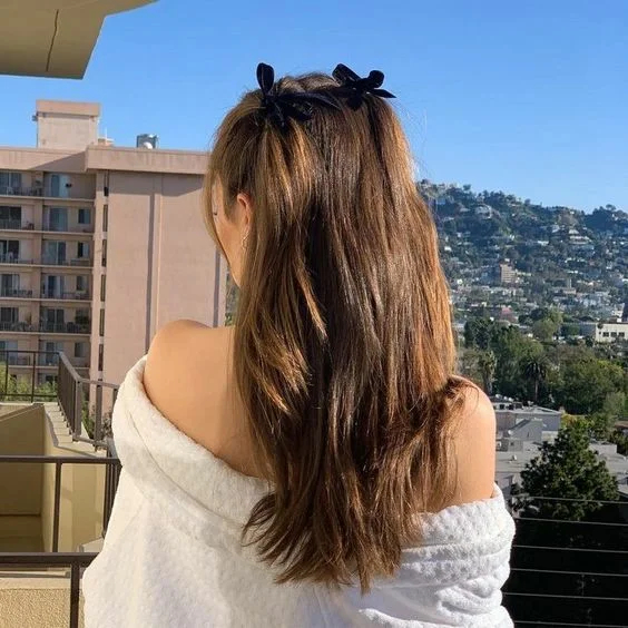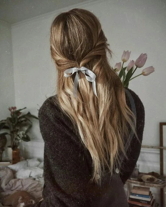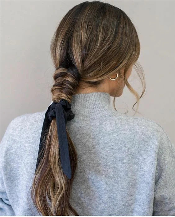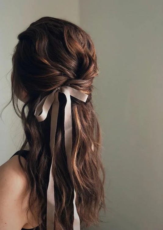 Такий лаконічний акцент зробить зачіску легкою і особливою. Образ виходить романтичним і ніжним, навіть якщо це просто хвіст – “мальвінка”. Але якщо ви хочете зачіску трішки складнішу, то попередньо зробіть легку пляжну хвилю для текстури, заколіть два пасма волосся, злегка скрутивши їх, і потім підв’яжіть хвостик легкою стрічкою в тон будь-якої частини одягу.