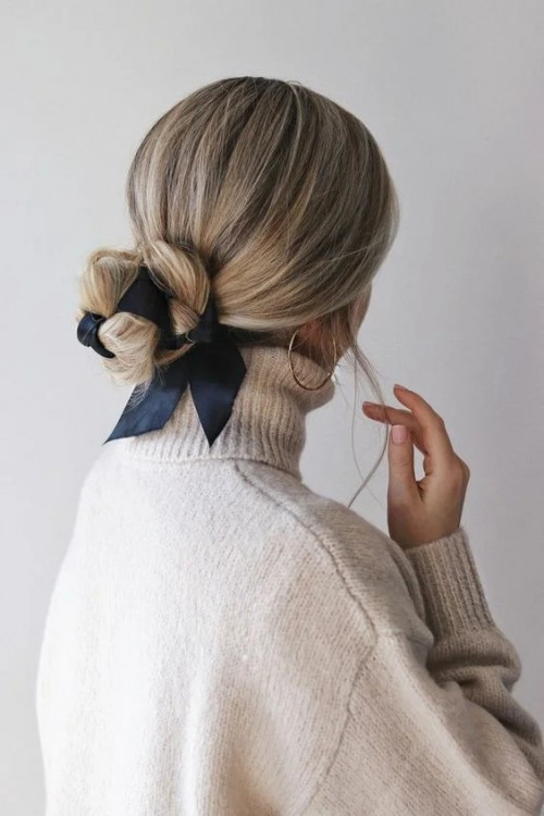 Пучок теж можна поєднувати зі стрічкою. Ви можете просто обв’язати пучок по колу стрічкою по типу гумки або зробити щось складніше. Наприклад, заплести стрічку в хвіст (скрутіть її з волоссям) і тільки потім зберіть пучок. Зафіксуйте все невидимками.