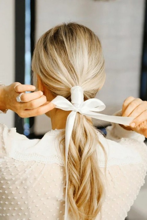 Якщо потрібна супер-швидка зачіска, то гумка і стрічка – це все, що вам потрібно. Зробіть низький і злегка вільний хвіст, обв’яжіть гумку стрічкою і зробіть бант. Чудово!
