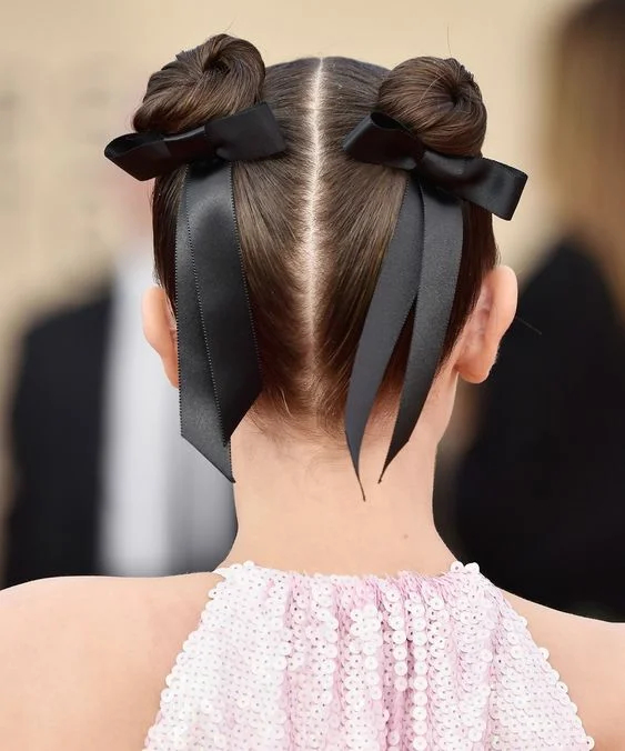 Що якщо поєднати в одній зачісці відразу два тренди? Тоді вийде щось схоже: два гладких високих пучка, підв’язаних стрічками. Стильно і незвично, правда?