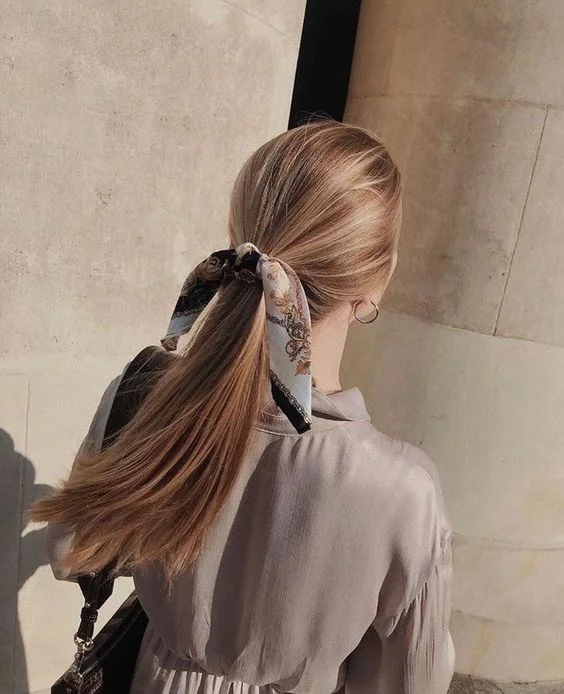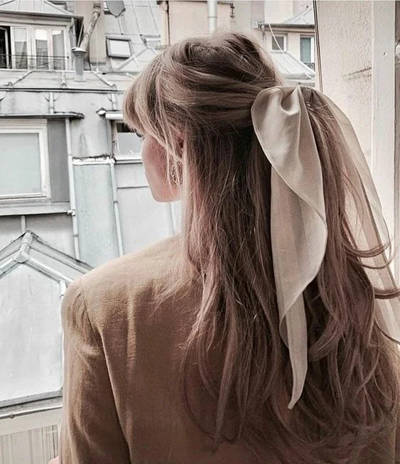 Актуальні стрічки для волосся – вузькі, у мінімалістичному стилі, або широкі, по типу шовкової невеликої хустки. Просто зберіть хвіст і підв’яжіть стрічку на гумку і образ відразу стане більш жіночним і милим.