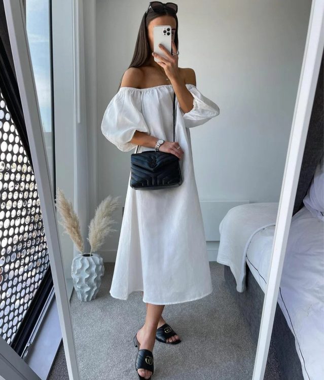 А ця біла сукня з натуральної тканини підійде як для повсякденного носіння, так і для урочистих випадків. Доповнити її можна будь-якими контрастними аксесуарами та взуттям, як на фото.