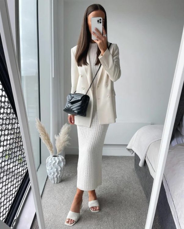 На фото нижче дівчина демонструє комплект із того ж блейзера, але в поєднанні з іншою сукнею. Контрасту однотонному образу надає чорна сумочка.