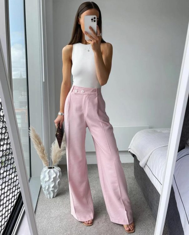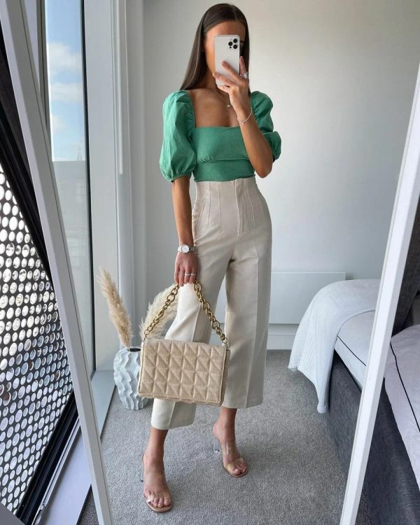 Білі штани з високою талією чудово виглядають у комплекті із зеленою блузкою. Поєднання блакитної зелені та білого – модний хіт цього літа.