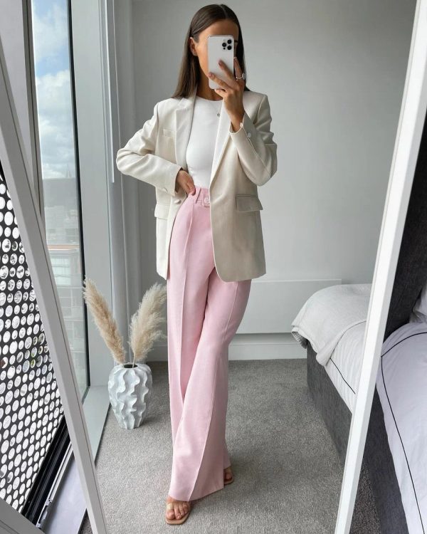 Два фото в рожевих штанах: з блейзером та без. Зверніть увагу, як по-різному виглядають образи.