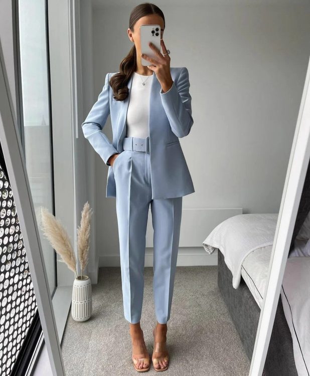 Ніжні кольори в одязі допомагають заспокоїтись у динамічному ритмі сучасного життя. Чудове рішення для походу на роботу: блакитний літній костюм із простою білою блузкою.