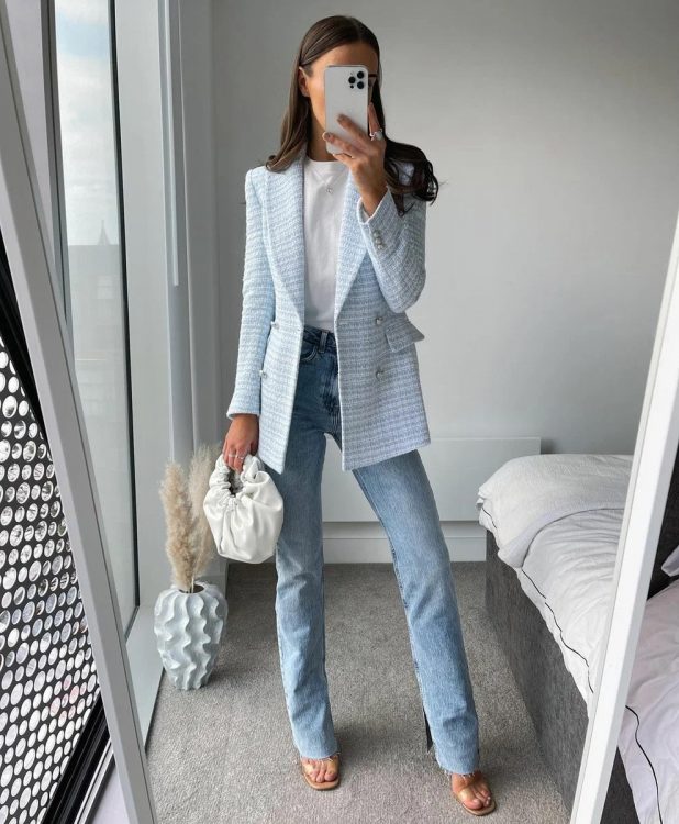 Джинси стали класичною модою, без них не обходиться жоден сезон. На фото дівчина показує, як стильно можна носити джинси з піджаком в тон.