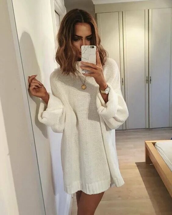 Якщо потрібен жіночний образ – віддаємо перевагу спідницям-плісе. Якщо більш повсякденний – одягаємо улюблені джинси. Жінки невисокого зросту можуть носити такий светр як сукню.