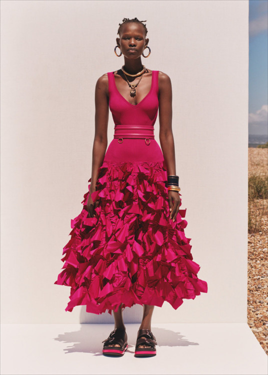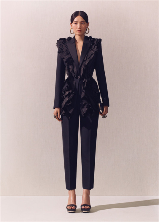Сукні-квіти, немов виконані з шовкового паперу в техніці оригамі, демонструють високу майстерність британського крою – як і архітектурні блейзери зі шлейфом або спідниці плісе зі шкіри.