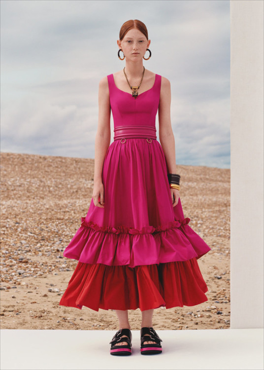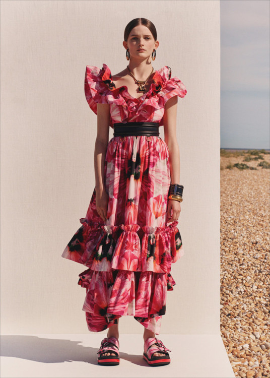 Зробивши акцент на фуксії в багатьох образах, Бертон з’єднала її з червоним: схоже, що це стане нашим улюбленим колірним поєднанням у майбутньому сезоні. А ідеї для квіткових принтів вона запозичила у Королівському ботанічному саду Лондона, воскресивши рідкісні або вимерлі квіти з колекції головного гербарію країни.