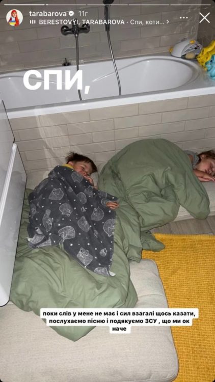 Світлана Тарабарова неабияк хвилюється за життя своїх дітей. Вночі співачка спала з ними у ванній, аби зменшити ризик опинитись під завалами в разі влучення ракети. В Instagram-stories вона поділилась кадром, на якому показала старших сина й донечку. Діти Світлани Тарабарової спали на підлозі у ванній.
