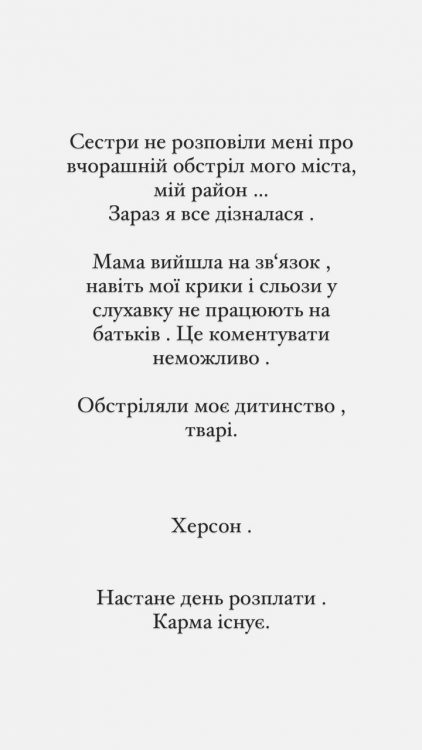 В Instagram-stories зірка повідомила, що російські окупанти обстріляли район, в якому живуть її батьки. Про це Світлана Тарабарова дізналась не відразу.