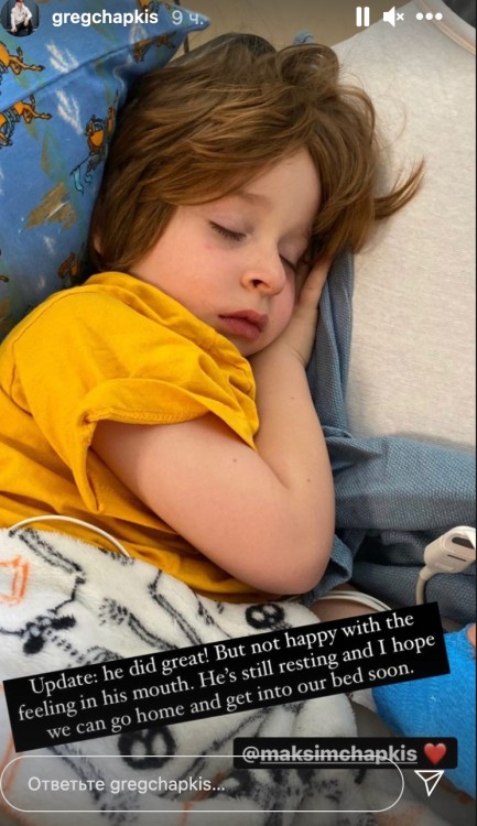 Проте, нещодавно Грег повернувся додому. У своїх соцмережах чоловік повідомив, що його сина терміново госпіталізували. За словами хореографа, хлопчику зробили стоматологічну операцію. В Instagram-stories Грег Чапкіс опублікував фото сина, який мило спить на ліжку. Після операції хлопчик почуває себе добре.