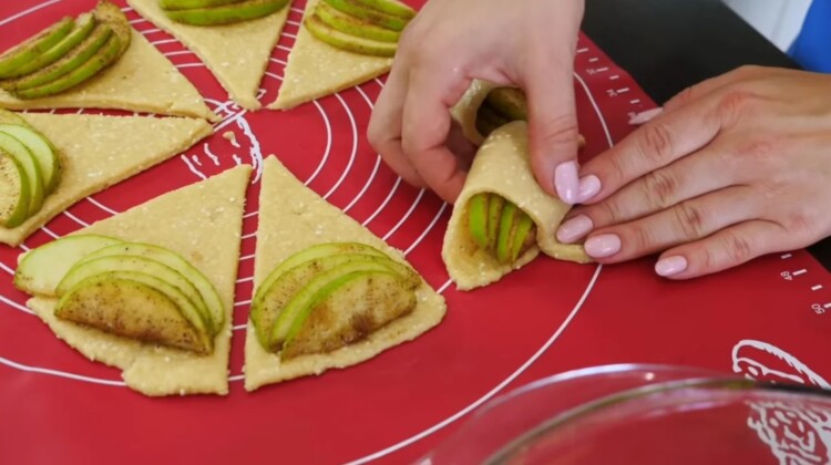 Розкатане коло розділити на чотири частини, а ті, в свою чергу, ще на половину. У підсумку: виходить 8 шматочків тіста. На кожен шматочок тіста викласти яблука.