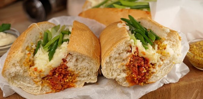 Змащуємо їх гірчицею та викладаємо начинку з фаршу. Зверху посипаємо тертим сиром та прикрашаємо зеленою цибулею. Хот-доги ставимо у мікрохвильовку та підігріваємо до розплавлення сиру. Смачного!