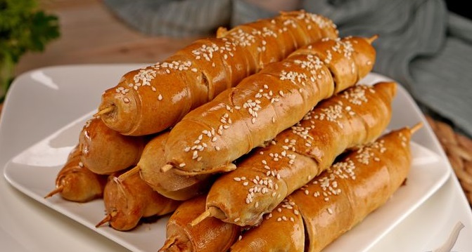 Кожну м’ясну паличку загортаємо в тісто. Викладаємо їх на деко, застелене пергаментом. Зверху змащуємо яєчним жовтком та посипаємо кунжутом. Ставимо в духовку й запікаємо 35 хвилин при температурі 180 градусів. Смачного!