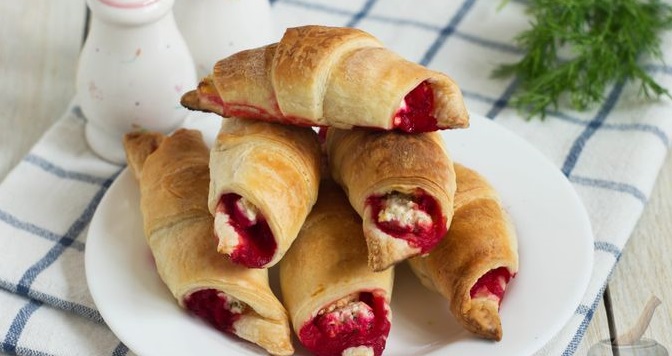 Потім дістаємо тісто та посипаємо борошном. Ділимо його на однакові шматочки. Викладаємо буряк та бринзу та формуємо рогалики. Потім відправляємо їх на деко та запікаємо в духовці 20 хвилин при температурі 180 градусів. Смачного!