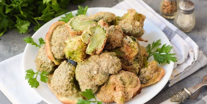 Вкінці додаємо борошно та ще раз перемішуємо. В готову суміш відправляємо броколі. Потім обвалюємо її в панірувальних сухарях. Викладаємо на деко, змащене олією, та відразу ставимо в духовку. Броколі запікаємо 20 хвилин при температурі 180 градусів. До столу закуску подаємо з будь-яким соусом. Смачного!